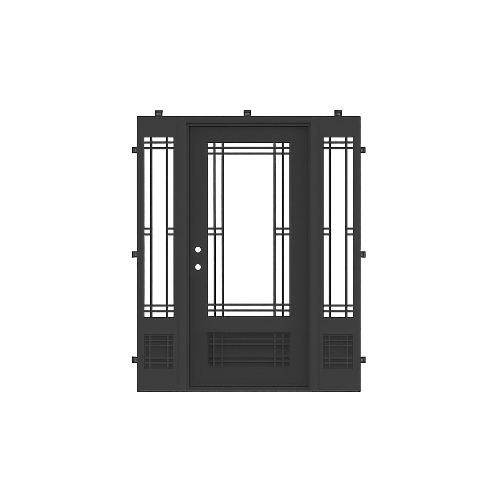 We use 5/8″ tempered dual pane glass with glass already installed in our wrought iron doors. For custom exterior iron doors, we have over 6 different glass options.