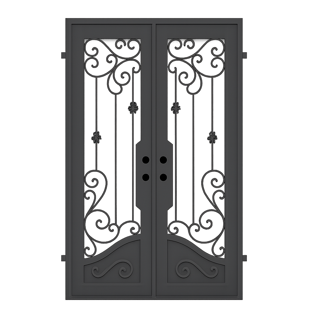 We use 5/8″ tempered dual pane glass with glass already installed in our wrought iron doors. For custom exterior iron doors, we have over 6 different glass options.