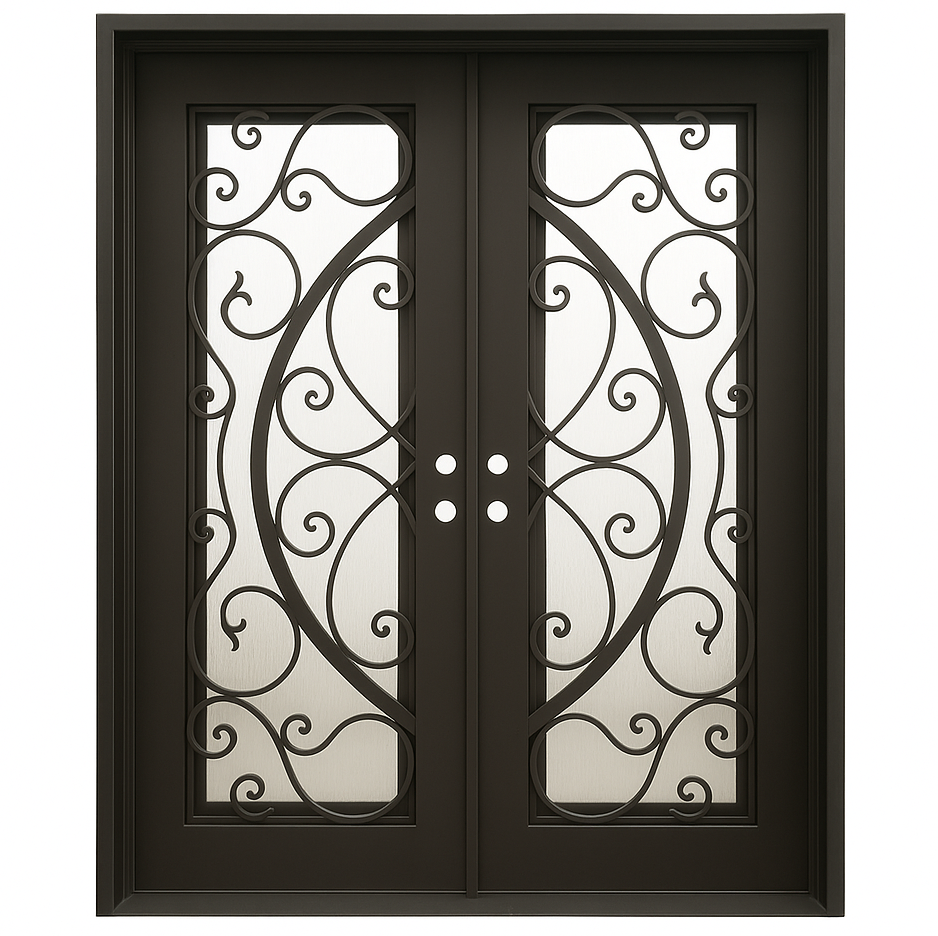 We use 5/8″ tempered dual pane glass with glass already installed in our wrought iron doors. For custom exterior iron doors, we have over 6 different glass options.