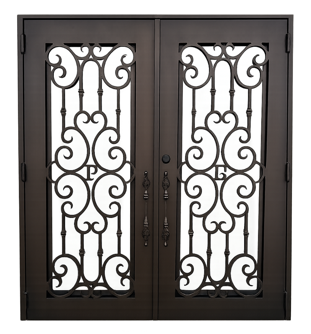We use 5/8″ tempered dual pane glass with glass already installed in our wrought iron doors. For custom exterior iron doors, we have over 6 different glass options.