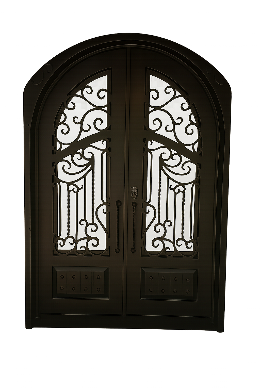We use 5/8″ tempered dual pane glass with glass already installed in our wrought iron doors. For custom exterior iron doors, we have over 6 different glass options.