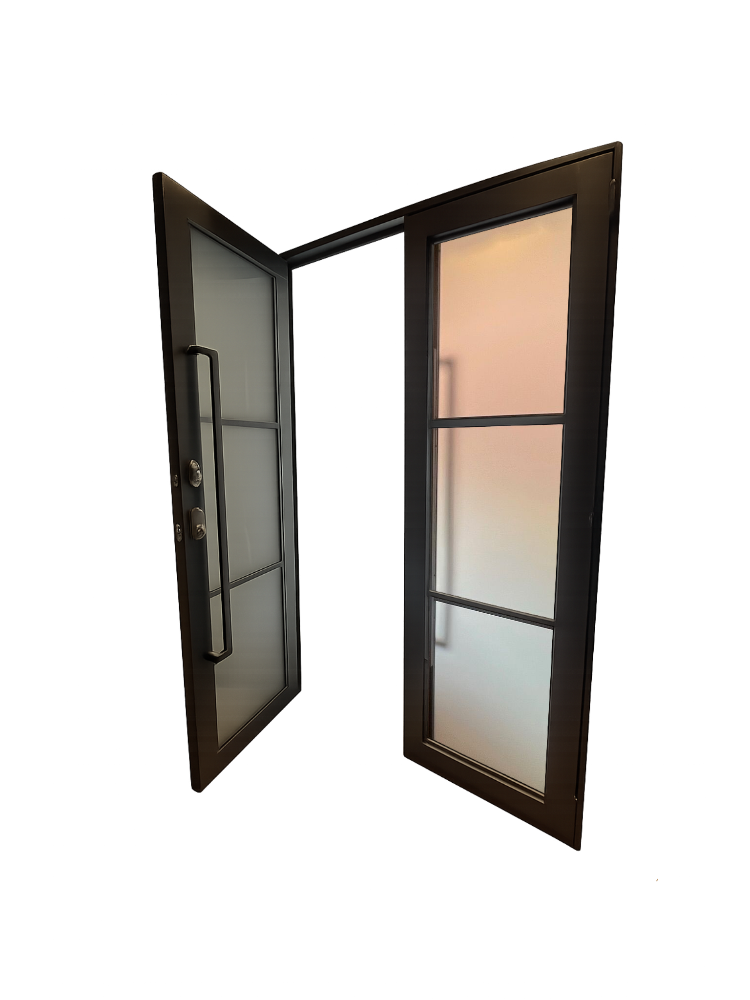 Both of our modern steel doors & wrought iron doors are pre-hung meaning the jamb, door, glass, flush bolt, roller latch, & sweep is included.